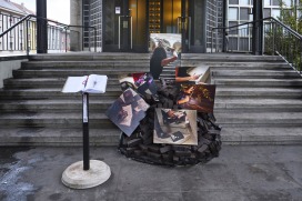 „Vertreibung aus dem Tempel“,Fotoinstallation mit einem Haufen Kohle im Rahmen der „Sakralen Zeiten?“ 2022